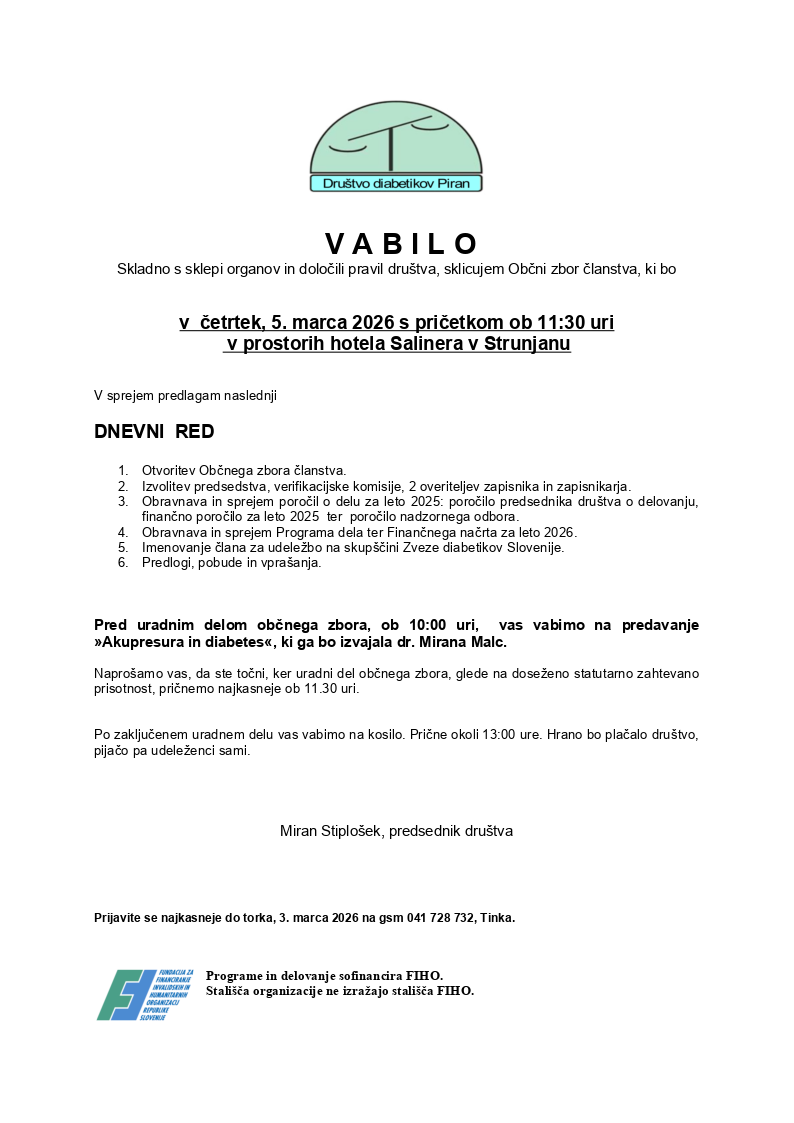 Vabimo vas, na Občni zbor članstva, ki bo v v četrtek, 5. marca 2026 s pričetkom ob 11:30 uri